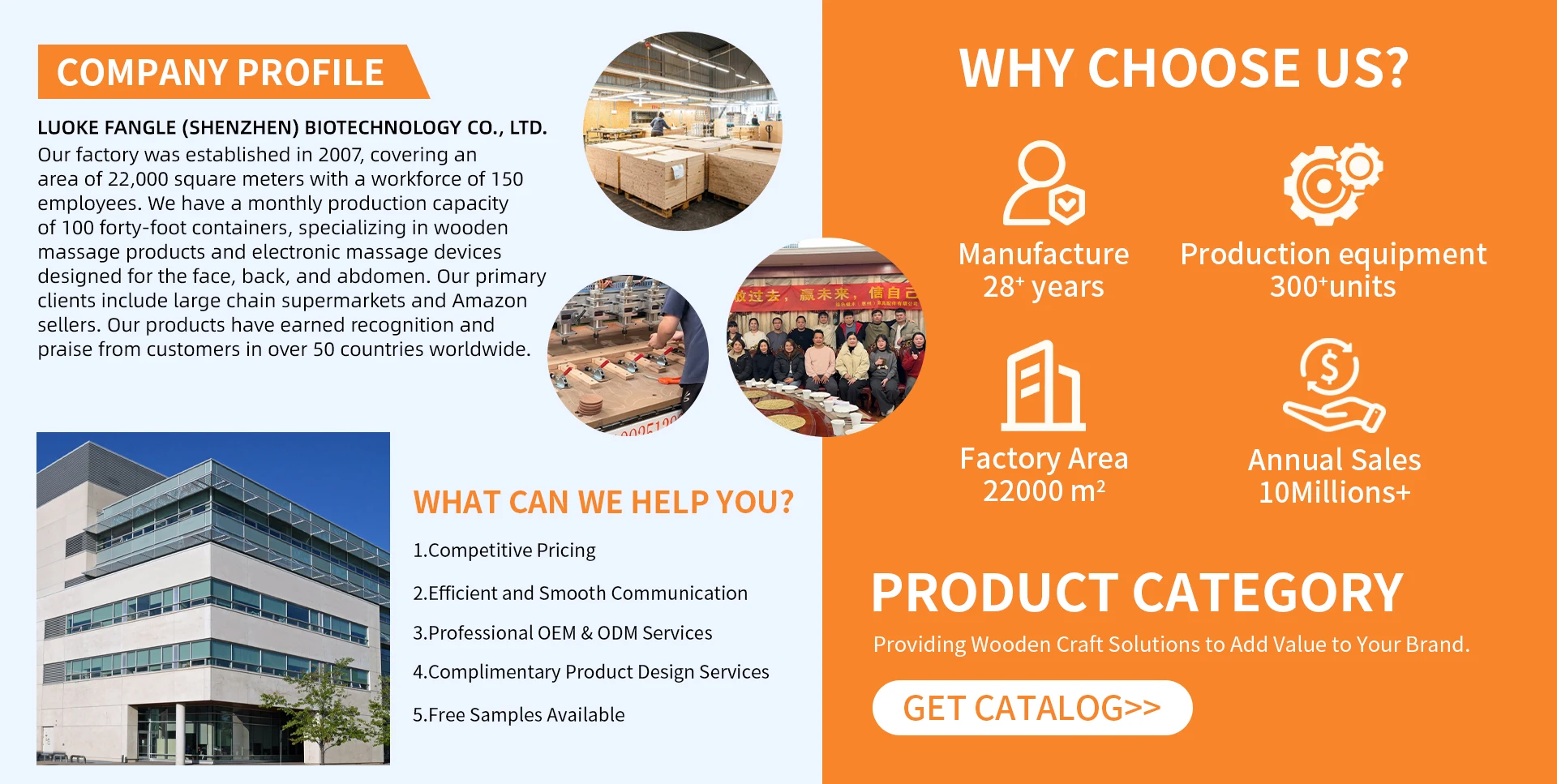 Our factory was established in 2007, covering an area of 15,000 square meters, with 150 employees. The monthly output is 100 40-foot containers. We mainly produce wooden massage products and electronic massage products for facial, back and belly massages.